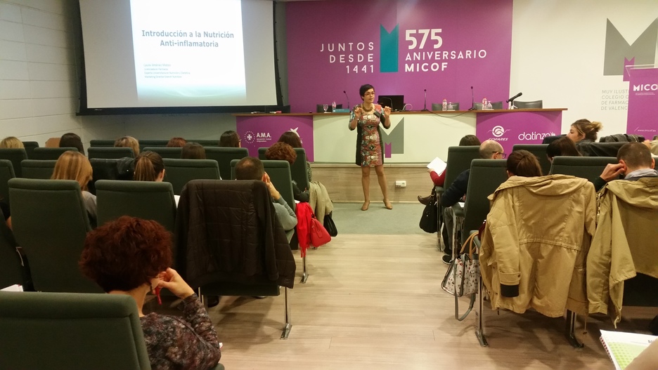 El Muy Ilustre Colegio Oficial de Farmacéuticos de Valencia ha acogido durante la mañana de hoy la jornada ”Actualizaciones en nutrición antiinflamatoria”. La farmacéutica y experta universitaria en Nutrición y Dietética, Laura Jiménez Mateo, ha sido la encargada de abordar el tema.