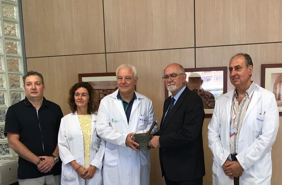 Durante un acto celebrado hoy en el Hospital General de Valencia, el presidente del MICOF, Jaime Giner y el vocal Enrique Bellver, en representación de la Comisión de Museo, han devuelto al Hospital General de Valencia el mortero en bronce "Joaquín Forés", datado de 1791 y con gran importancia histórica para la farmacia valenciana. La pieza ha estado expuesta durante unos meses en el Colegio durante la muestra "575 años de historia de la farmacia valenciana".