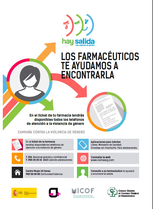 El Muy Ilustre Colegio Oficial de Farmacéuticos de Valencia (MICOF) sigue su lucha incansable contra este tipo de violencia con su campaña “Hay salida a la Violencia de Género. Los farmacéuticos te ayudamos a encontrarla”.