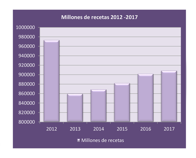 El crecimiento en el número de recetas es el que aparece en el gráfico siguiente desde que se implantó la nueva aportación de los beneficiarios en el año 2012 y se produjo la desfinanciación de casi 500 medicamentos.