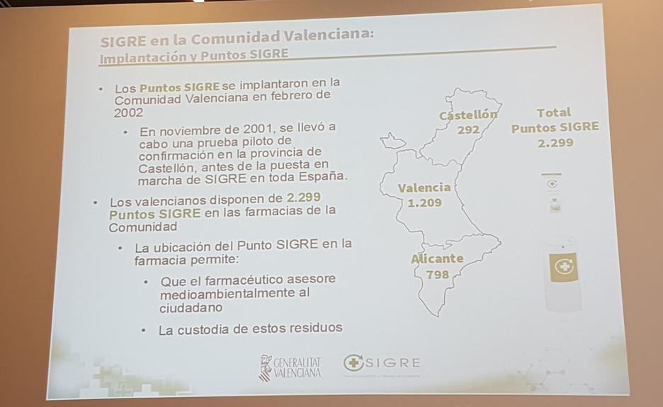 Uno de los logros que se han presentado en este encuentro informativo es el hecho de que el hábito de reciclar los envases, vacíos o con restos de medicamentos, está implantado en el 87% de los hogares valencianos. En la Comunidad Valenciana existen un total de 2.299 puntos SIGRE ubicados en la práctica totalidad de las farmacias existentes, que cuentan con las garantías medioambientales y sanitarias para la recogida selectiva de estos residuos.