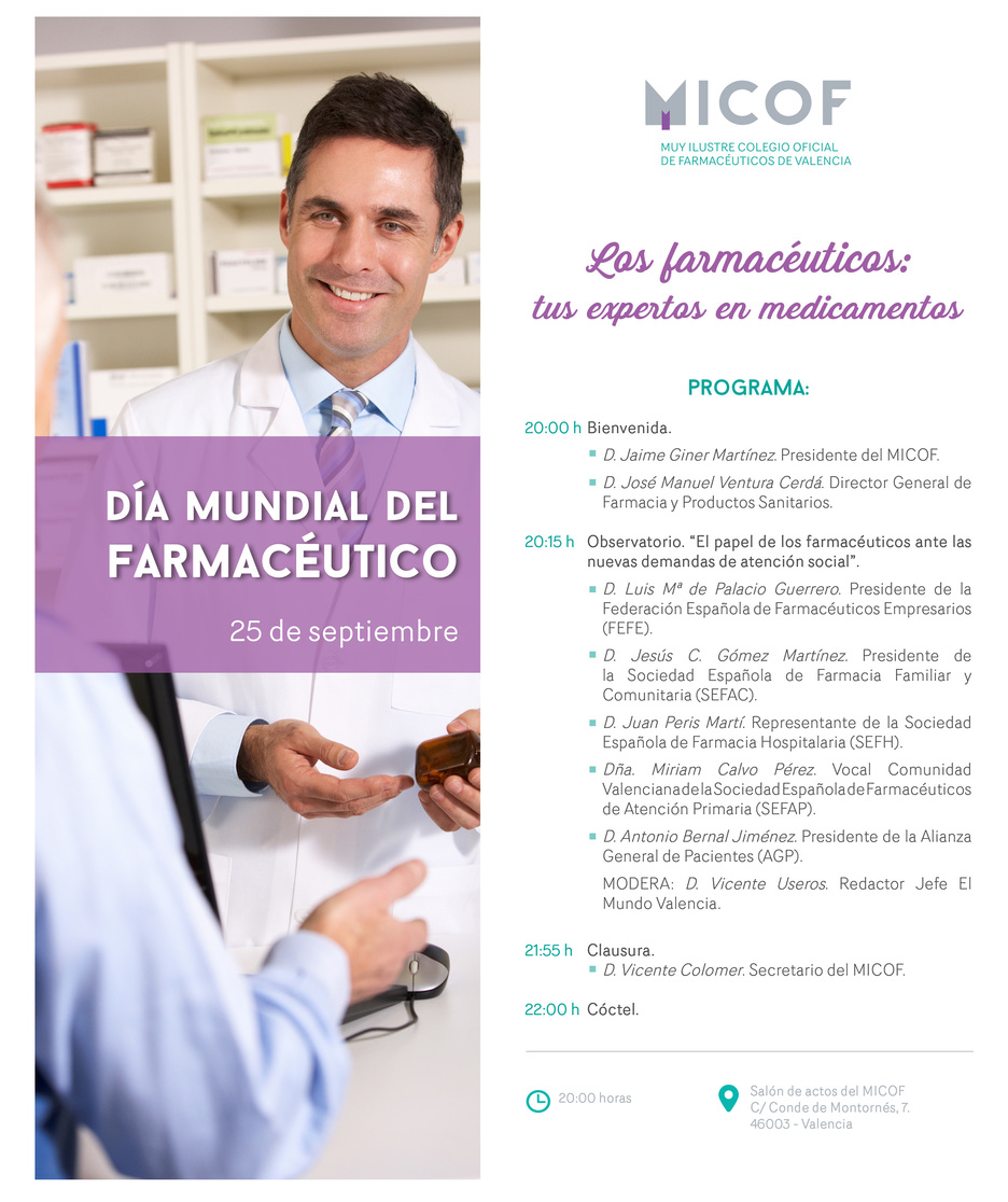 Siguiendo esta línea, y tras el nuevo rumbo seguido por la Conselleria en la atención sociosanitaria y la puesta en marcha del programa de atención farmacéutica domiciliaria, Domi-EQIfar, el MICOF quiere celebrar este emblemático día reivindicando el papel de todos los farmacéuticos.
