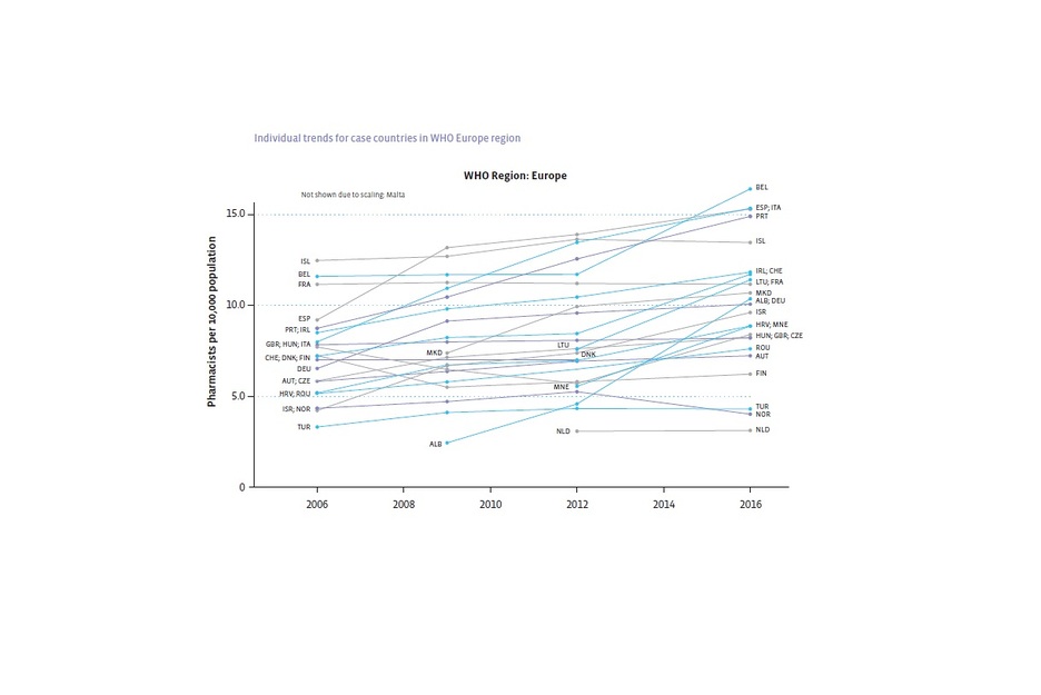 El informe ha analizado la capacidad de trabajo y los indicadores económicos de 75 países y ha llegado a la conclusión de que el número de farmacéuticos (por cada 10.000 habitantes) se ha incrementado desde 2006 y se espera un incremento del 40 por ciento hasta 2030 (desde 2016).