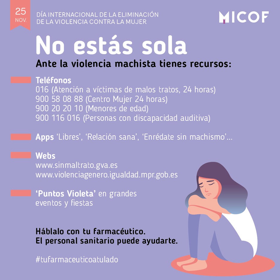 El Colegio de Farmacéuticos de Valencia preparó diversas acciones, como la participación en la campaña en la que se incluyen en los tíckets de dispensación de las oficinas de farmacia los teléfonos de asistencia a la mujer (016 teléfono nacional que no queda registrado, 900 58 08 88 teléfono Mujer 24 y el teléfono para adolescentes 900 20 20 10 de la fundación ANAR).