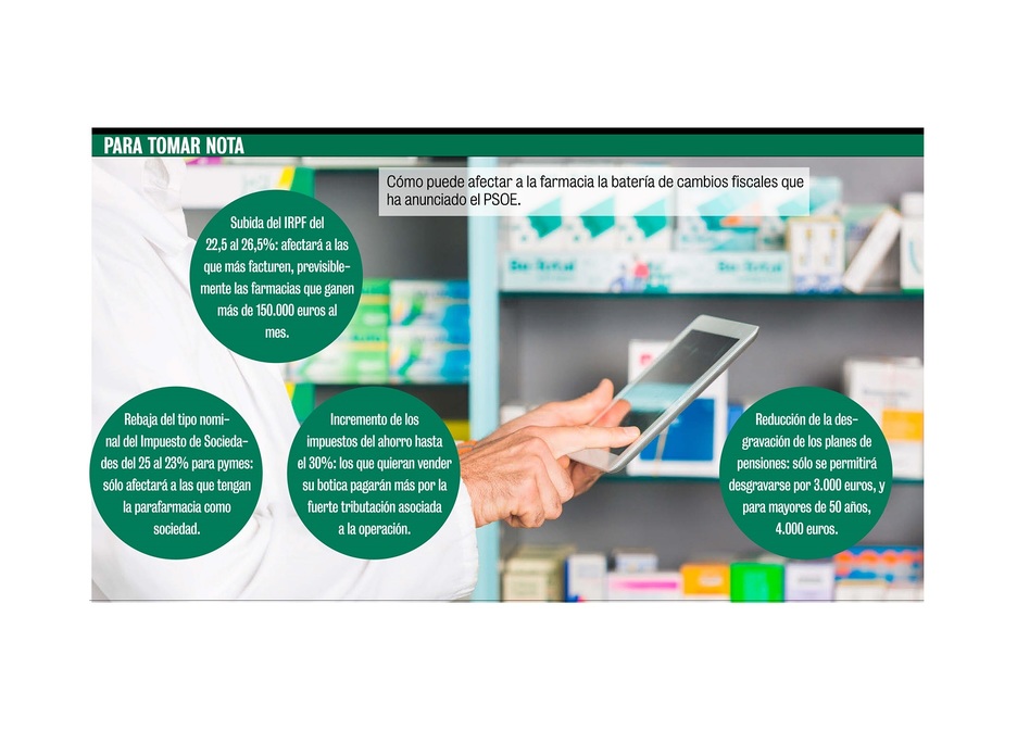 El programa económico que ha propuesto recientemente el PSOE supondrá una subida masiva de impuestos que, de llevarse a cabo, afectaría de lleno a los titulares de la oficina de farmacia, sobre todo a los que hacen más caja. Para conocer el impacto de los cambios tributarios planteados por el Gobierno, CF ha consultado a expertos fiscalistas que han desmenuzado las consecuencias de la puesta en marcha de estas medidas para la factura fiscal de la oficina.