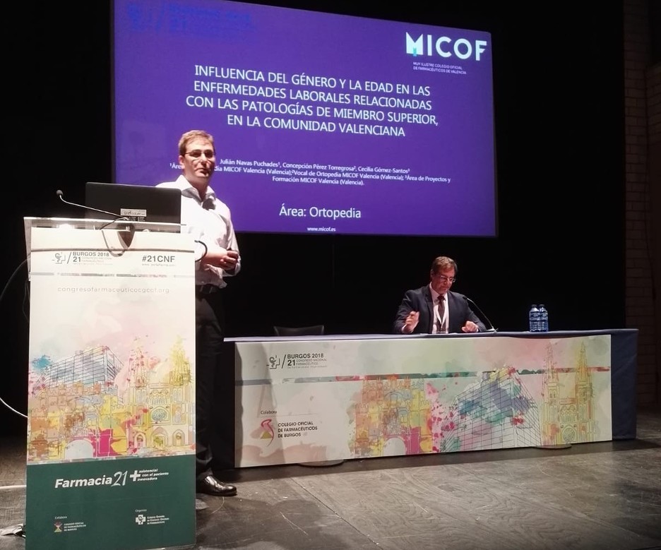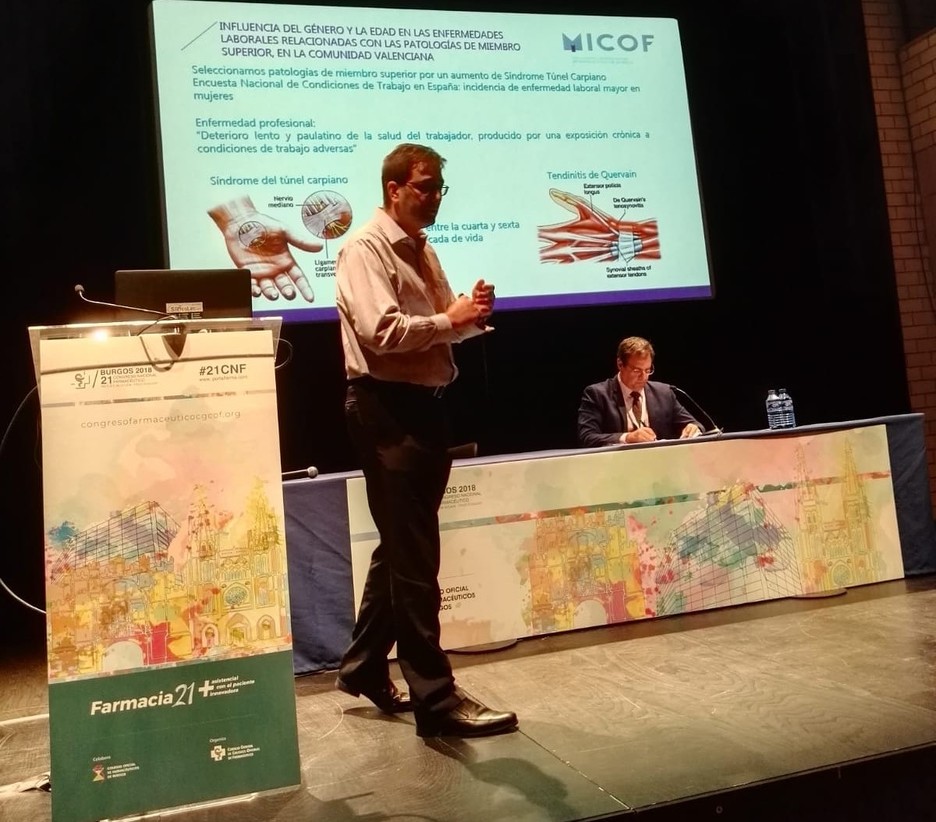 Durante el congreso se han expuesto los diversos trabajos que realizan los colegios. En este sentido, de los tres pósteres realizados por el MICOF, uno fue seleccionado por el comité científico del Congreso para ser expuesto al resto de asistentes de forma oral. Julián Navas, Coordinador del área de Ortopedia del MICOF, fue el encargado de explicar el póster “Influencia del género y la edad en las enfermedades laborales relacionadas con las patologías del miembro superior, en la Comunidad Valenciana”.
