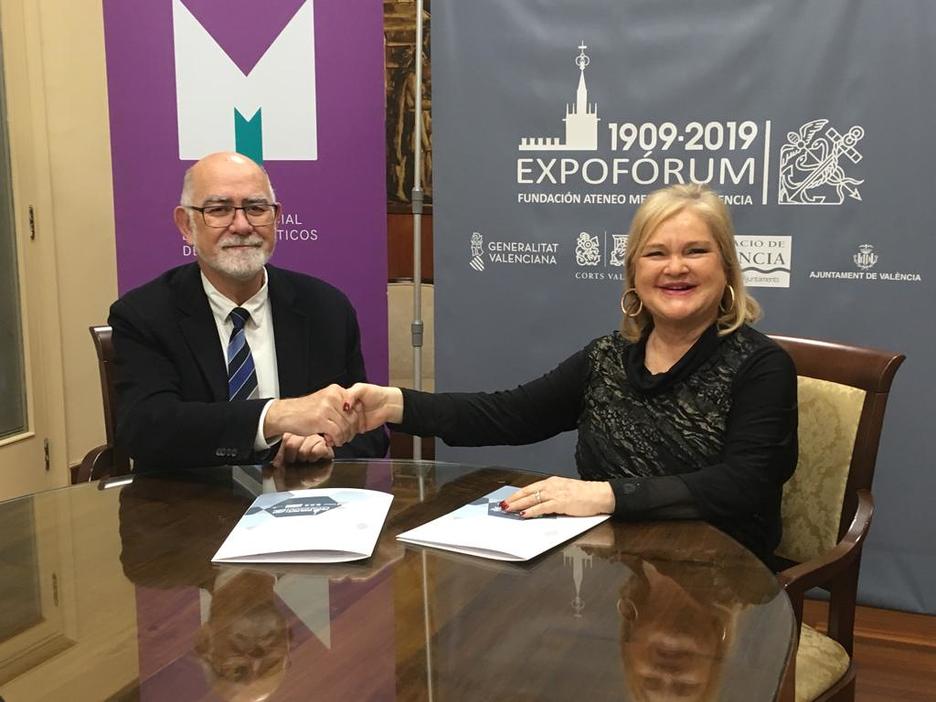 El presidente del MICOF, Jaime Giner, ha firmado esta tarde un convenio de colaboración con la presidenta de la Fundación Ateneo Mercantil de la Comunitat Valenciana, Carmen de Rosa, con el fin de participar en la celebración de “Expoforum 2019”.
