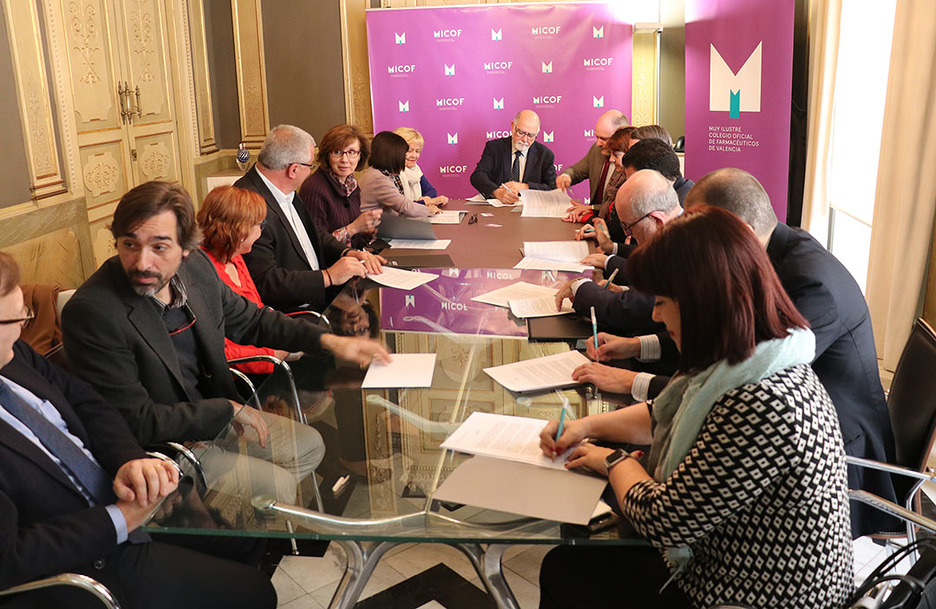 El MICOF firmó ayer un acuerdo de colaboración con los laboratorios CINFA, los almacenes de distribución COFARES, CENTRO FARMACÉUTICO, HERMANDAD FARMACÉUTICA, FEDERACIÓN FARMACÉUTICA, BORGINOFARMA, ALIANCE HEALTHCARE y la Asociación Valenciana de Afectados de Lupus (AVALUS) para participar en la campaña de fotoprotección para 2019 que consistirá en la distribución de kits de fotoprotección en las oficinas de farmacia de la provincia de Valencia a las personas afectadas por la enfermedad del lupus.