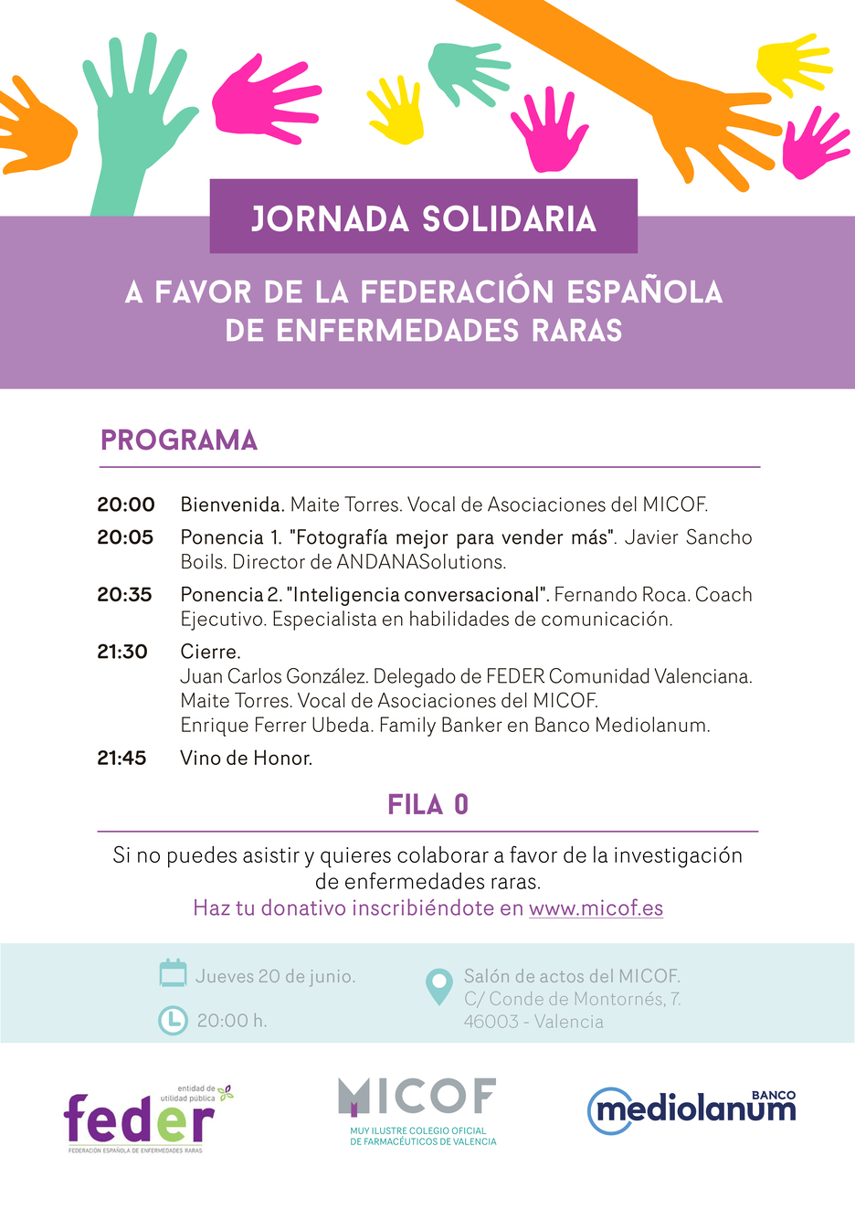 El MICOF y Banco Mediolanum han organizado una jornada solidaria con el objetivo de recaudar fondos a favor de la Federación Española de Enfermedades Raras (FEDER) para  poner en marcha diversos proyectos que mejoren la calidad de vida de los niños, jóvenes y adultos con una enfermedad rara.
