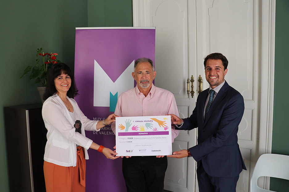 La vocal de Asociaciones del MICOF, Luisa Giménez y Enrique Ferrer, del Banco Mediolanum, han entregado este mediodía al Delegado de la Federación Española de Enfermedades Raras (FEDER) de la Comunidad Valenciana, Juan Carlos González, los donativos aportados por los colegiados en la I Jornada Solidaria celebrada en el MICOF a favor de las enfermedades raras.