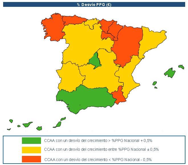En el mapa que incluimos a continuación se observa cómo el tanto por ciento de crecimiento respecto a la media (%PPG) es superior en determinadas Comunidades Autónomas, siendo las que más crecen Andalucía, Baleares y Madrid.