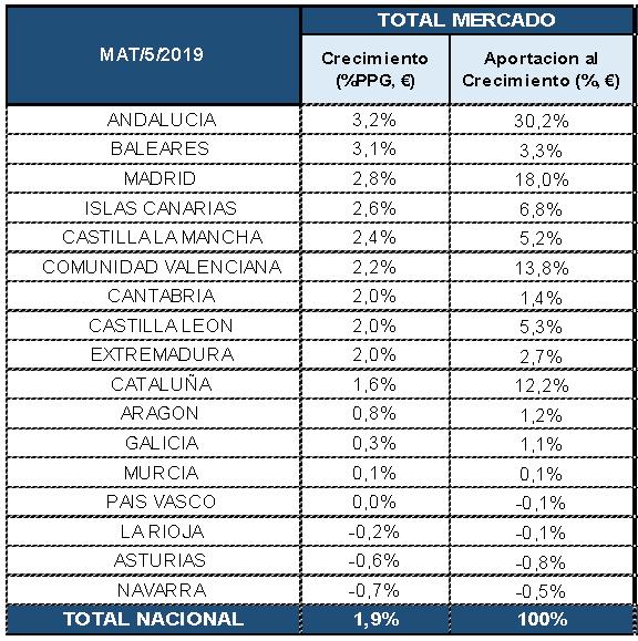 En la zona media de crecimiento se encuentra la Comunidad Valenciana, cuyo crecimiento ha sido del 2,2 – también inferior al del mercado financiado- y su aportación al crecimiento total del mercado ha sido del 13,8%.