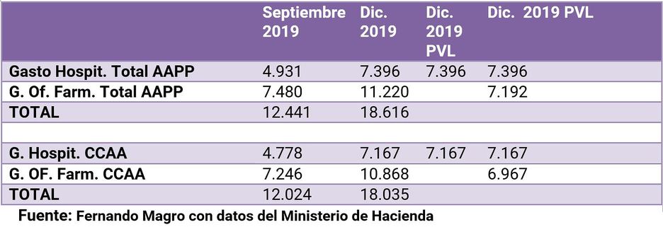 Como se ha indicado, estos datos hay que homogeneizarlos ya que el hospitalario está a PVL teniendo en cuenta los descuentos de los Reales Decretos leyes correspondientes, y el que se produce en oficinas de farmacia a PVP con IVA.