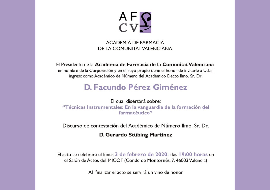 Ingreso del Dr. D. Facundo Pérez Giménez como académico de número de la academia de farmacia de la comunitat valenciana