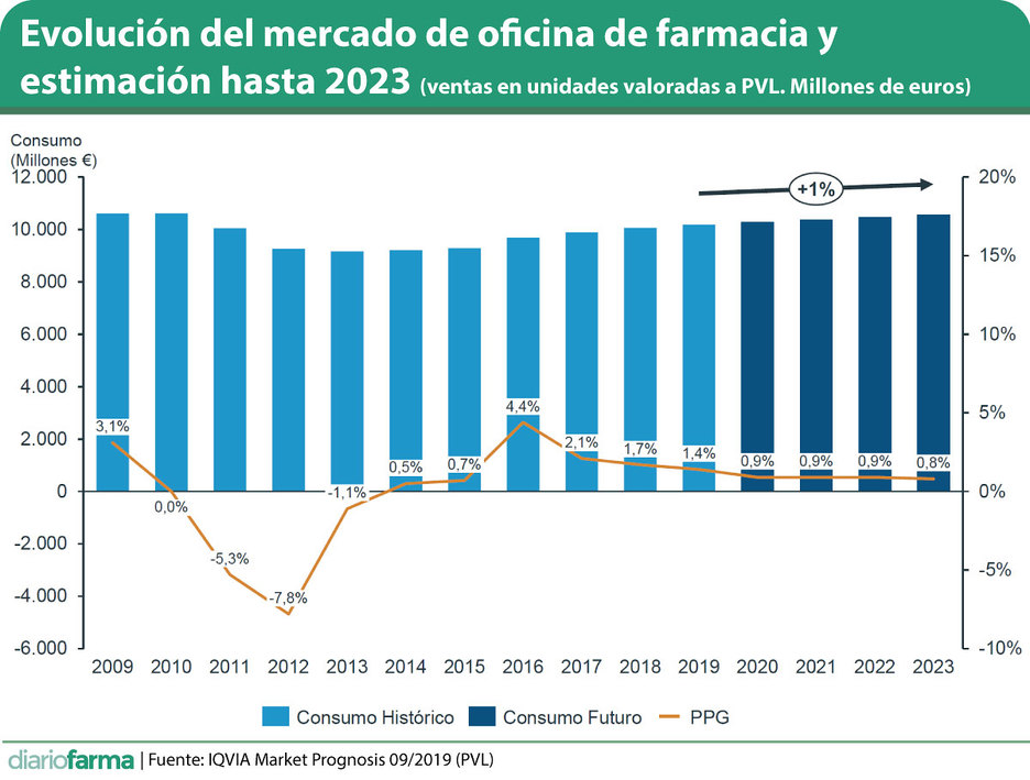 La evolución del mercado total viene dirigida desde hace unos años por la evolución de las ventas en hospital, que valoradas a PVL, y sin considerar descuentos ni techos de gasto, ya superan a las ventas que se producen en oficina de farmacia. En concreto, el mercado hospitalario asciende a 11.439 millones de euros y el de oficina de farmacia, 10.282 millones de euros, una relación 53% - 47%.