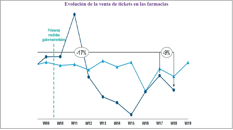 La consultora IQVIA viene realizando un seguimiento semanal de la evolución de las ventas de las farmacias, constatando que, en conjunto, desde el inicio de la pandemia de Covid 19 se ha producido un descenso del número de tickets vendidos en las farmacias de un -17% respecto al mismo periodo del año anterior.