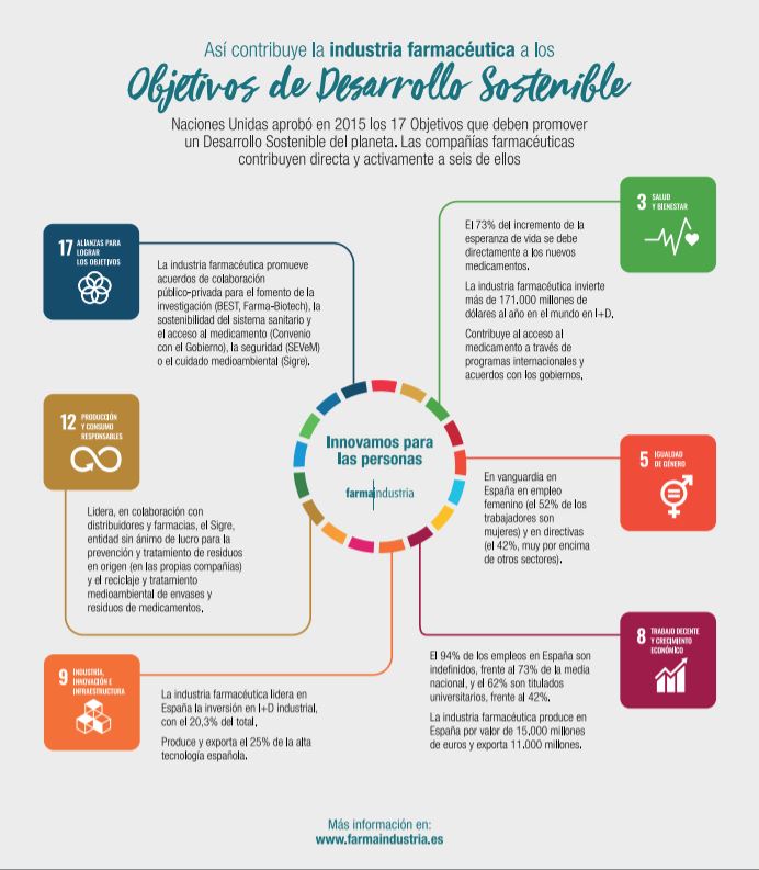 Las compañías farmacéuticas, en la medida en que trabajan para mejorar la salud y la calidad de vida de las personas y fomentan un modelo económico basado en el empleo cualificado, la investigación, el desarrollo y la innovación, constituyen uno de los sectores clave a escala global para lograr que en 2030 los ODS sean una realidad.