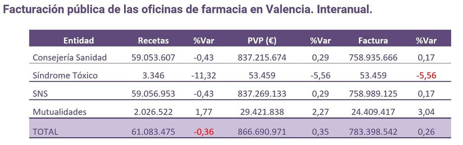 En términos interanuales, la facturación pública crece un 0,26%, debido a la reducción de recetas en un -0,36 que lleva el importe de la factura pública de la provincia de Valencia en oficina de farmacia hasta los 866,6 millones de euros en términos interanuales, sumando mutualidades y SNS, incluidas las recetas a beneficiarios del síndrome tóxico.