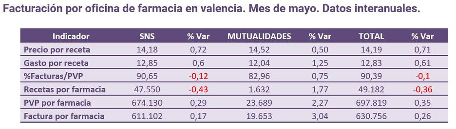 La facturación pública de las oficinas de farmacia de la provincia de Valencia registró en mayo el segundo mes consecutivo de decrecimiento, tanto en el número de recetas como en importes.