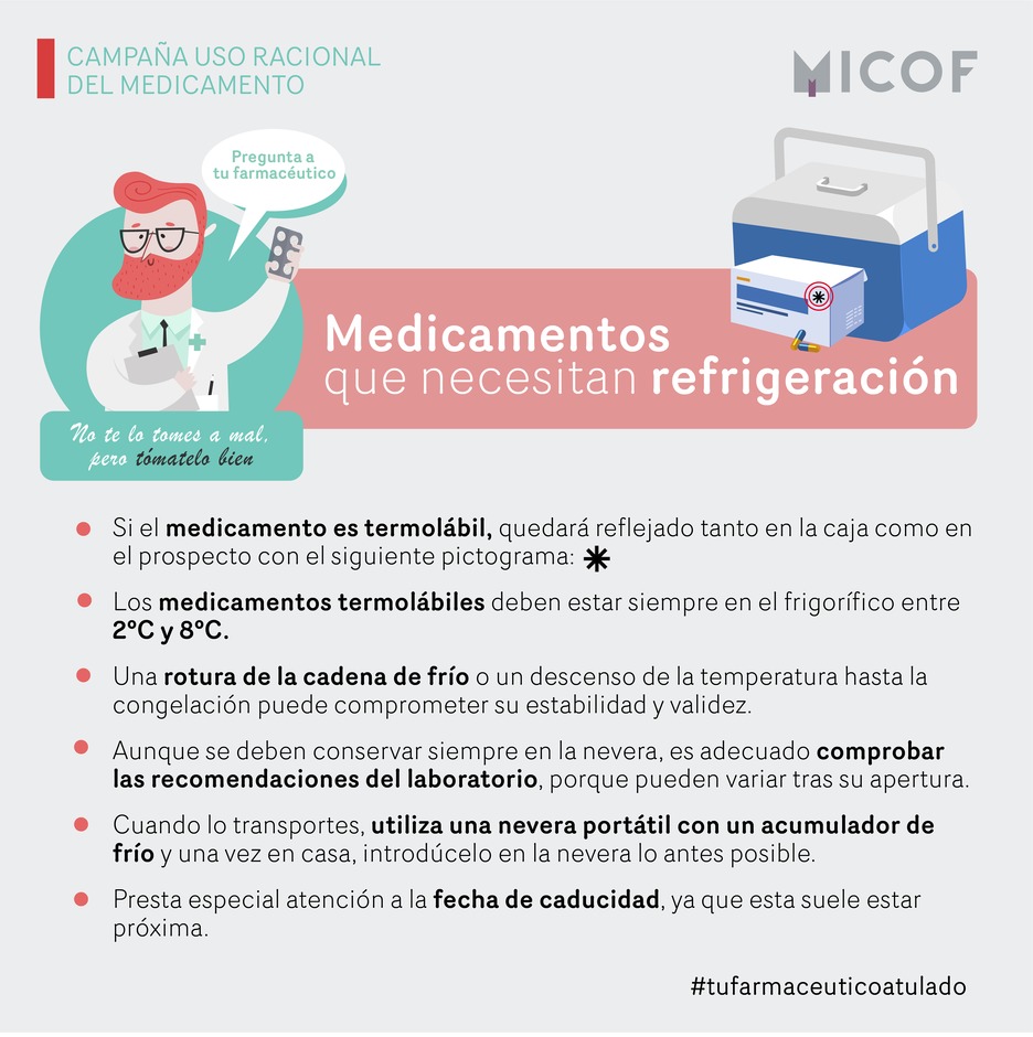 La adecuada conservación de los medicamentos es imprescindible para asegurar su actividad farmacológica. Para ello, es preciso mantenerlos en un lugar fresco y seco, preferiblemente dentro de su embalaje original para preservarlo de la luz. Ciertas especialidades farmacéuticas entre las que se encuentran las vacunas, insulinas, algunos colirios y antibióticos, son susceptibles a temperaturas superiores a 8ºC es por ello por lo que deben conservarse en nevera entre 2ºC y 8ºC desde su fabricación hasta el momento de su administración. De esta forma se mantiene su actividad farmacológica de forma óptima, ya que, con motivo del calor estos se pueden descomponer o desnaturalizar, perdiendo sus propiedades originales, pudiendo afectar a la seguridad de este. Sin embargo, cuando estos se exponen a un aumento de temperatura se acelera, en general, el deterioro de los productos, mientras que las bajas temperaturas pueden facilitar el deterioro de algunos materiales plásticos, o la formación de flóculos o gránulos en ciertas vacunas. Las propiedades del medicamento que podrían verse afectadas y sus consecuencias son: