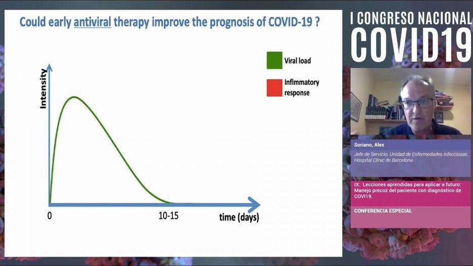 Tras la revisión de éstos y otros estudios, Soriano concluye que con la aplicación del tratamiento antiviral en fases precoces, en las que se alcanza el pico de carga viral, "se podría demostrar que es ahí donde se consigue la mayor eficacia". Admite que, a día de hoy, "ninguno de los estudios se ha hecho en esta etapa", aunque se refirió a uno de Gilead con su fármaco, remdesivir, del que esperan "datos positivos". El tiene claro que se necesita "tratamiento antivírico con administración precoz para reducir ingresos hospitalarios y en UCI, así como la mortalidad".