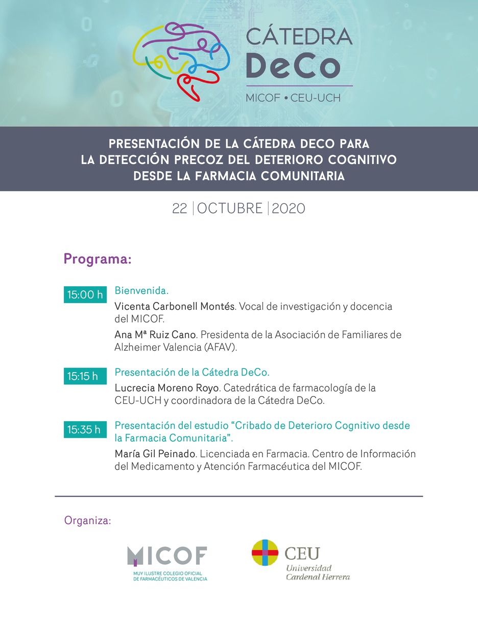 La Cátedra DeCo nace con el objetivo de contribuir al interés científico por identificar lo antes posible a los individuos susceptibles de desarrollar disfunción cognitiva, a través de las farmacias comunitarias de la provincia de Valencia.