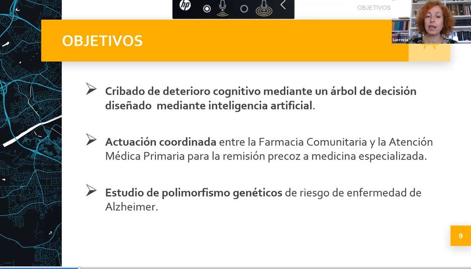 Seguidamente Lucrecia Moreno ha explicado cómo surgió la Cátedra DeCo, una formación de postgrado que, en un principio, tendrá una vigencia de tres años pero que se espera que sean muchos más. La coordinadora de la Cátedra Deco ha incidido en la importancia de todos los estudios que se hacen con la finalidad de frenar esta enfermedad, cuyas repercusiones son a nivel social, económico y sanitario. En este sentido ha apuntado que la demencia “podría suponer un 10% del total del gasto sanitario” y se estima un gasto de 30.000€ al año por paciente. Entre los retos pendientes para poder instaurar tratamientos en el momento en el que son efectivos se encuentra la realización de un diagnóstico temprano, ya que “cuando la enfermedad está muy avanzada no es efectivo” ha declarado Moreno. Para finalizar su presentación también ha manifestado que, si se quiere tener ciudades neuroprotegidas, “los médicos y los farmacéuticos tenemos que ir juntos para conseguir un cribado, un diagnóstico y poner un tratamiento de la forma más precoz posible a los pacientes afectados”.