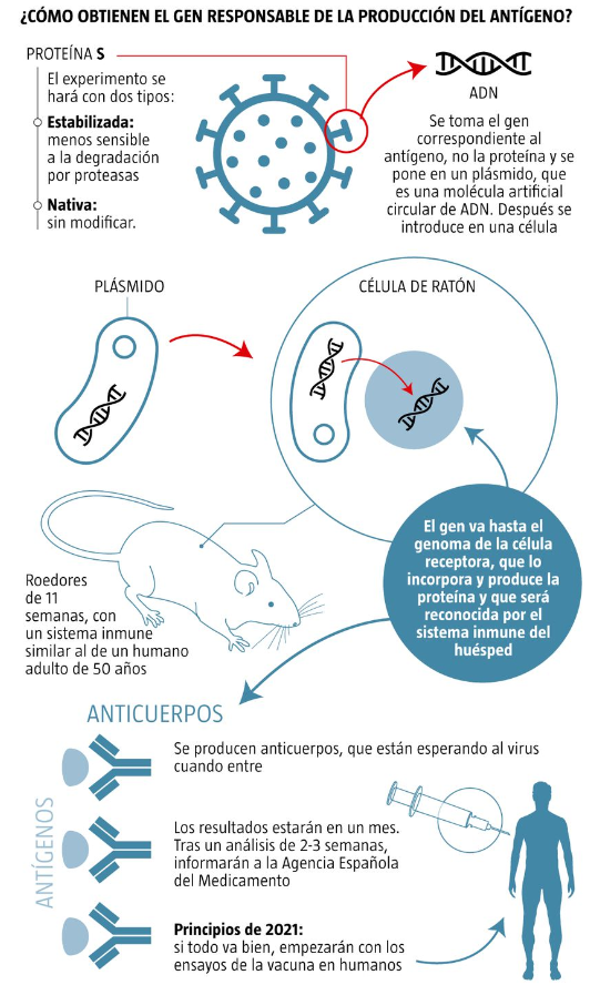 Es la parte del experimento más importante porque en ver de trabajar con prisas, que también, están simulando en roedores de laboratorio que tienen receptores humanos ACE2 cómo protegería la vacuna contra el virus que causa la Covid-19 y que utiliza el procedimiento similar al de la vacuna de la leishmaniosis: una vacuna basada en ADN recombinante, que introduce, en vez del patógeno atenuado, una proteína purificada correspondiente a un antígeno del virus que induzca protección frente a la infección por él mismo.