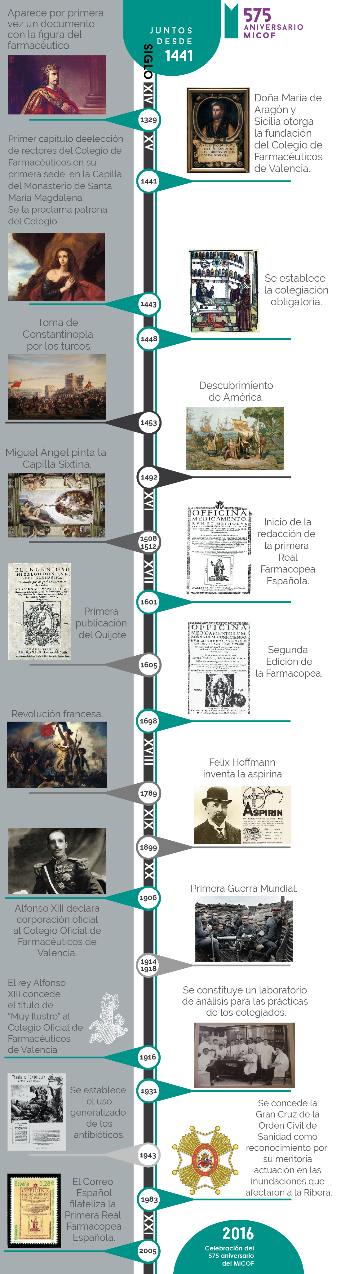 El Muy Ilustre Colegio Oficial de Farmacéuticos de Valencia (MICOF), considerado el más antiguo del mundo superando a asociaciones medievales como gremios o cofradías, fue fundado el 20 de marzo de 1441 por la reina Dña. María de Aragón y Sicilia, esposa de D. Alfonso el Magnánimo.