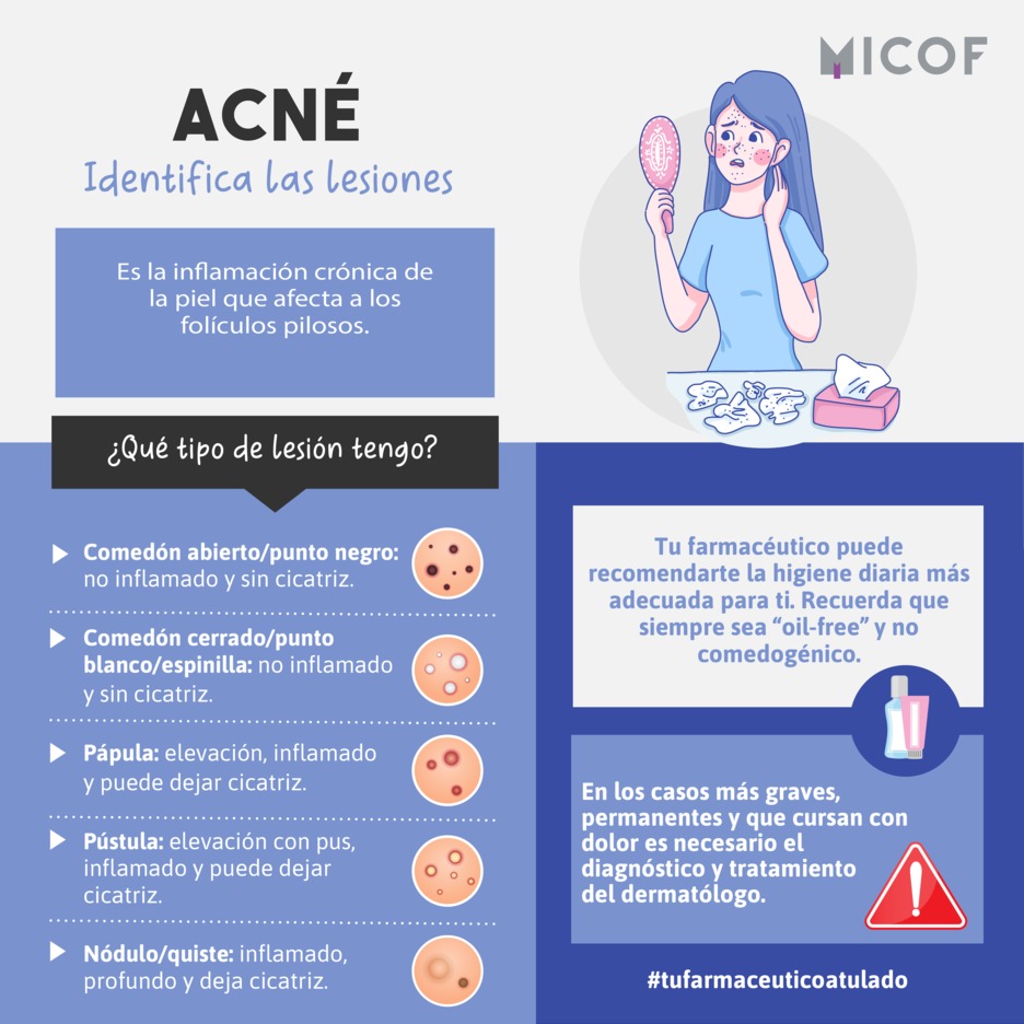 El acné no es simplemente un conjunto de granos, puntos negros y espinillas que aparecen en la zona T una y otra vez, sino que es una enfermedad inflamatoria que afecta a la unidad pilosebácea (nacimiento del pelo) en la que intervienen bacterias. Esta se caracteriza por la formación de diferentes lesiones presentes en la cara, el pecho y aproximadamente en la mitad superior de la espalda. Las diferentes lesiones del acné son: