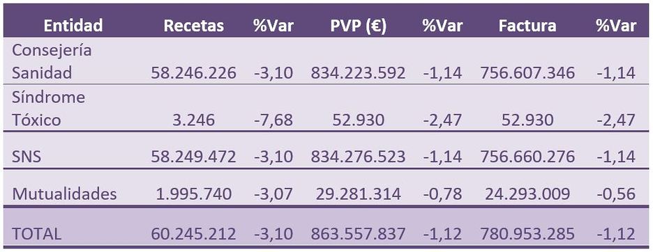 En términos interanuales, la facturación pública decrece solo un (-1,1%), Ya que las recetas por farmacia descienden un (-3,1%), que hace que el importe de la factura pública de la provincia de Valencia sea de 780,9 millones de euros, sumando mutualidades y SNS, incluidas las recetas a beneficiarios del síndrome tóxico.
