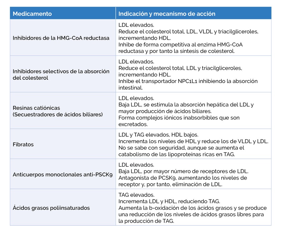 En la siguiente tabla se incluyen los fármacos indicados para la dislipemia y el mecanismo de acción correspondiente.
