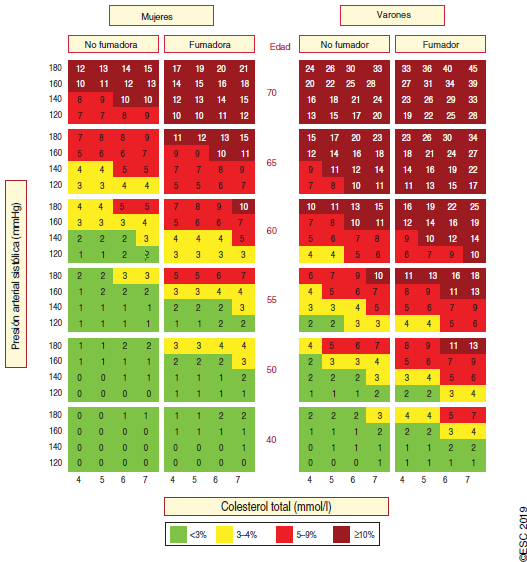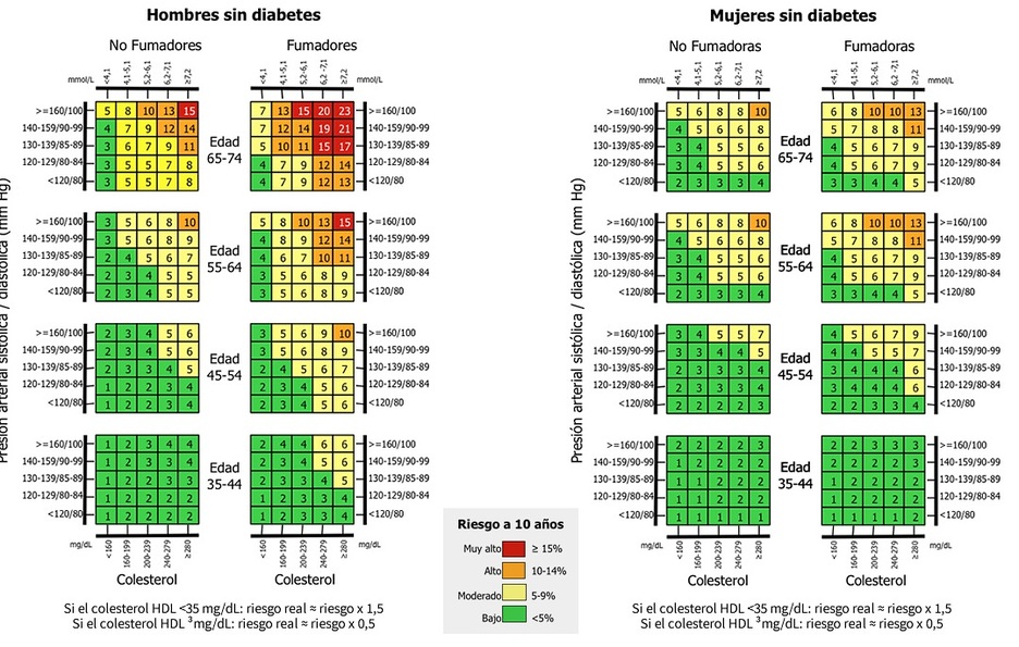 A través de estas tablas, podemos calcular el RCV estimado a 10 años contemplando la probabilidad de sufrir ciertas enfermedades en función del modelo utilizado. Para aquellos pacientes con una probabilidad inferior al 5% se considerará bajo y por lo tanto un cambio en la dieta, realizar ejercicio, control de peso y la deshabituación tabáquica son las recomendaciones para mantener el riesgo bajo. Por otro lado, aquellas personas que presentan un riesgo superior al 5% el RCV es elevado y, por tanto, la recomendación es modificar el estilo de vida a la vez que un tratamiento farmacológico.