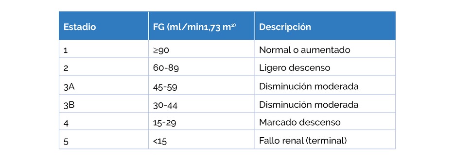 Para un diagnóstico y estadiaje adecuado, es necesario realizar una estimación del filtrado glomerular. La gravedad de la ERC está clasificada en 5 categorías o estadíos que hacen referencia a la filtración glomerular (FG), mientras que la albuminuria, en 3.