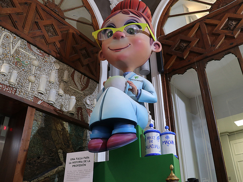 La institución colegial planta parte de su monumento fallero en homenaje a la profesión farmacéutica en el interior de su sede de Valencia