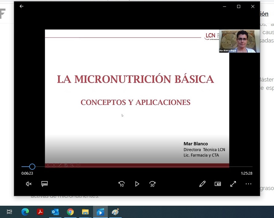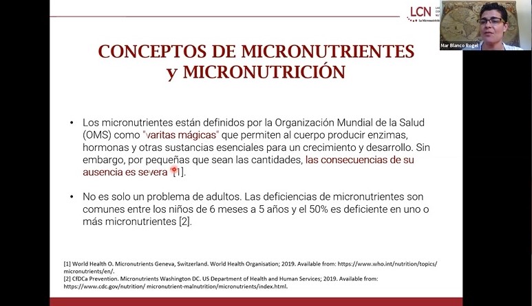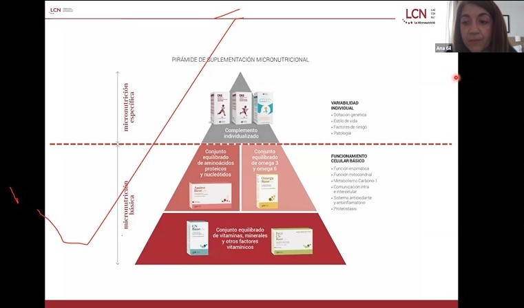 Durante la sesión online se ha hablado, entre otros temas, sobre el concepto de micronutrientes y bases bioquímicas; implicación de los micronutrientes básicos; sinergias e interdependencias de los cofactores, coenzimas, factores vitamínicos y ácidos grasos; y las depleciones micronutricionales causadas por fármacos. Por último, Ana Gil, del departamento comercial de LCN, ha informado sobre diferentes productos relacionados con la micronutrición y que forman parte del catálogo de laboratorios LCN.