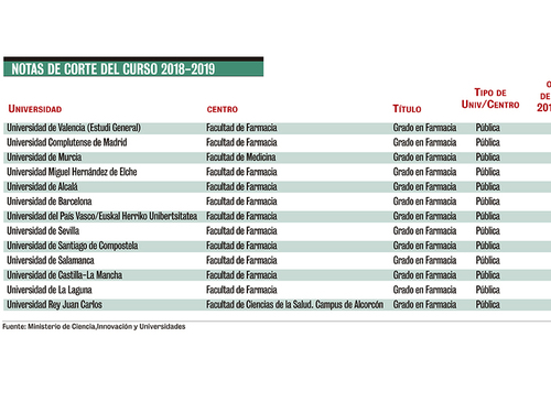 CF recopila las notas de corte para acceder al grado de Farmacia de las universidades públicas según los resultados de la EVAU (Evaluación de Acceso a la Universidad) del curso 2018/2019.