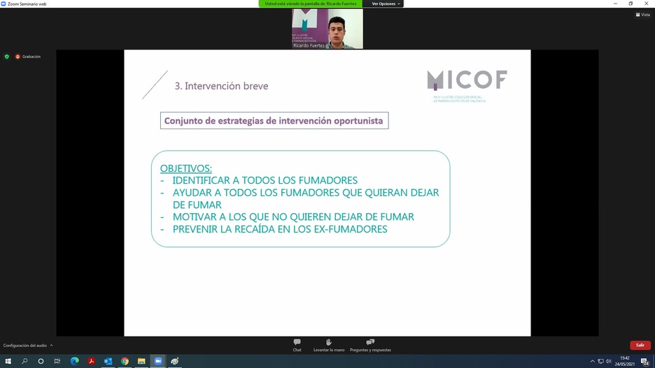 Con motivo de la Semana sin humo, del 25 al 31 de mayo, el MICOF ha celebrado esta tarde, en colaboración con Pfizer, el webinar ‘A un paso de dejar de fumar con la ayuda de tu farmacéutico’, una sesión formativa online en la que se ha informado sobre el servicio de cesación tabáquica Sense Fum y en cómo deben ser las intervenciones desde la farmacia.
