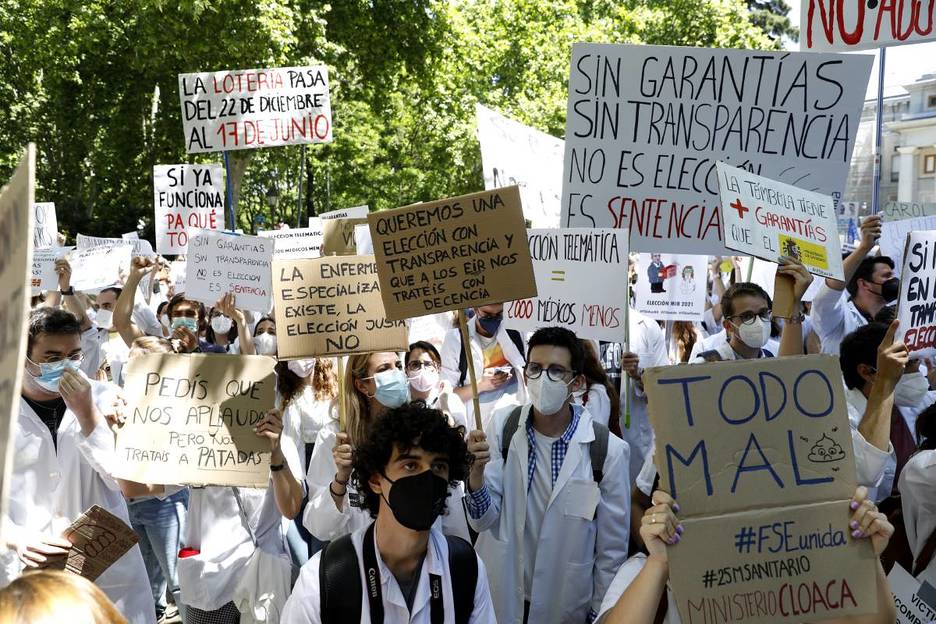 El Paseo del Prado se ha vestido de blanco y verde este martes. Los futuros residentes MIR, EIR y FIR 2021 se han manifestado este mediodía ante la sede del Ministerio de Sanidad para protestar contra el nuevo sistema de elección telemática de plaza. La manifestación ha sido convocada de manera conjunta por el sindicato médico CESM y la plataforma FSE Unida.