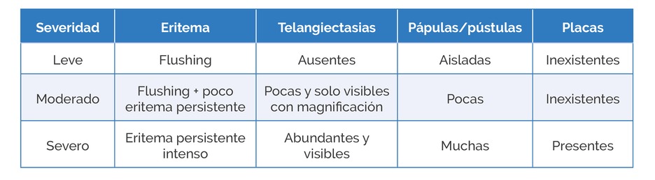 La severidad de la rosácea depende del área de extensión, intensidad, frecuencia, duración, localización, engrosamiento de la piel y número de lesiones de cada signo o síntoma que la persona presenta. A partir de la siguiente tabla podemos conocer su severidad: