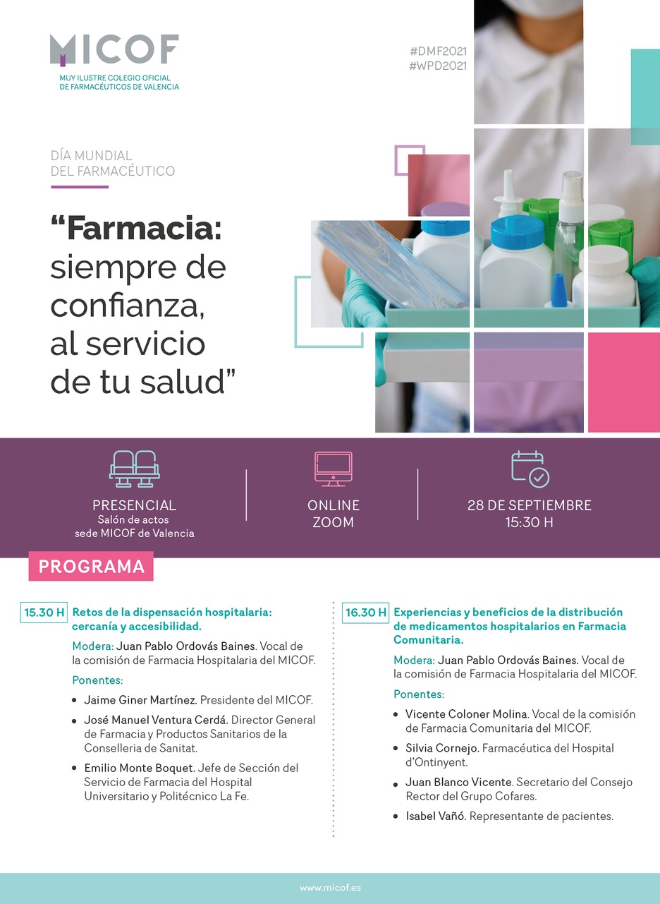 Para celebrar el Día Mundial del Farmacéutico el Muy Ilustre Colegio Oficial de Farmacéuticos de Valencia ha organizado un acto semipresencial bajo el lema “Farmacia: siempre de confianza, al servicio de tu salud”. A través de este acto, que tendrá lugar el martes 28 de septiembre a las 15:30h, queremos conmemorar con todos los colegiados del MICOF nuestro día y poner el acento en la aportación asistencial de la farmacia hospitalaria que se acerca más a sus pacientes a través del  programa piloto, puesto en marcha este año en la Comunidad Valenciana, de entrega de medicamentos hospitalarios en las oficinas de farmacia con la colaboración de los almacenes de distribución