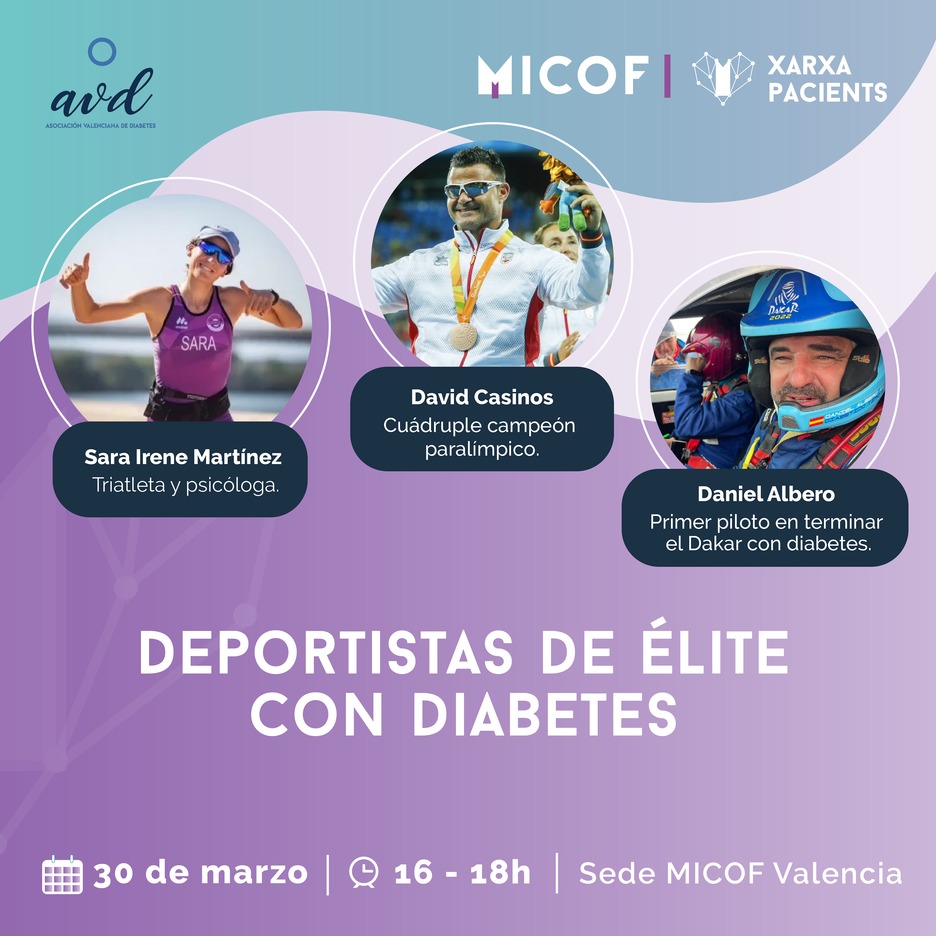 El Muy Ilustre Colegio Oficial de Farmacéuticos de Valencia (Micofha organizado una mesa redonda gratuita con deportistas de élite que tienen diabetes para así profundizar en la enfermedad a partir de sus experiencias. La jornada tendrá lugar en la sede colegial de Valencia el 30 de marzo a las 16 horas y contará con la presencia del cuádruple campeón paralímpico David Casinos, el piloto de Dakar Daniel Albero y la triatleta Sara Irene Martínez.