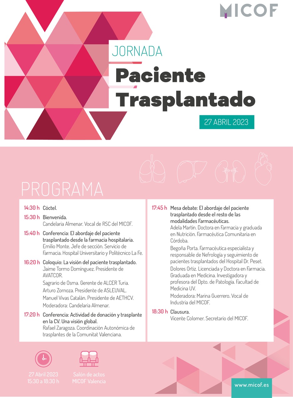 El programa está compuesto por un par de conferencias y un par de mesas de debate que se centrarán en la atención farmacéutica al paciente trasplantado desde sus distintas modalidades, las recomendaciones, sugerencias y peticiones de los pacientes al colectivo farmacéutico para que conozcan mejor su situación como personas trasplantadas y las recomendaciones sobre donación a cargo de un representante de la Coordinación Autonómica de Trasplantes de la Comunitat Valenciana.