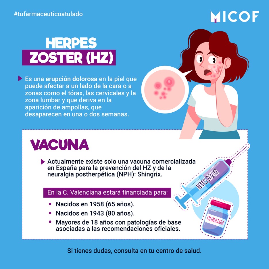 El Herpes zóster (HZ) o también conocido como “culebrilla” es una patología causada por el virus varicela zóster (VVZ). Dicho virus se distribuye por todo el mundo y causa tanto la varicela, cuando infecta por primera vez a una persona (primoinfección), como el herpes zóster (HZ), en posteriores reactivaciones por virus VVZ acantonados en los ganglios sensoriales. de forma general, la VVZ tiene una baja mortalidad. Sin embargo, supone un problema de salud pública por las complicaciones derivadas.