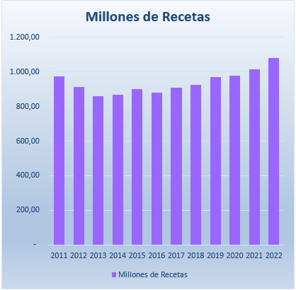 El crecimiento en el número de recetas es el que aparece en el gráfico siguiente desde que se implantó la nueva aportación de los beneficiarios en el año 2012, y se produjo la desfinanciación de casi 500 medicamentos.