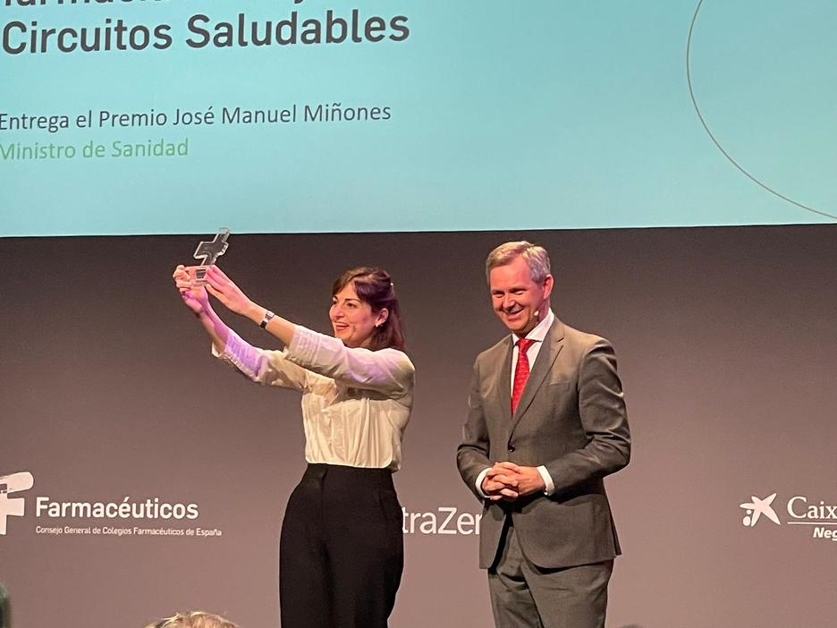 En total, se han entregado seis galardones, cuatro en la categoría social, y dos en la medioambiental. Respecto a la primera, en el ámbito de Colegios Oficiales de Farmacéuticos, el ganador ha sido el Muy Ilustre Colegio Oficial de Farmacéuticos de Valencia por el proyecto ‘Sostenibilidad de la farmacia rural y VEC como base para la mejora de la vida en el medio rural y su despoblación. Circuitos Saludables’, consistente en el desarrollo de cribados y acciones formativas por farmacéuticos comunitarios de trece municipios en riesgo de despoblamiento. El ministro de Sanidad ha sido el encargado de entregar el galardón a María Teresa Vicedo, vocal de Farmacia Rural.