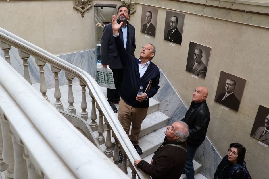 Los miembros de la Comisión de Museo José María de Jaime y Agustín Llopis acompañó al grupo en el recorrido de la historia de la farmacia valenciana y los entresijos del Palacete como son la fachada, los forjados exteriores, el gran portalón de la entrada, la monumental escalera de mármol o los frescos originales.