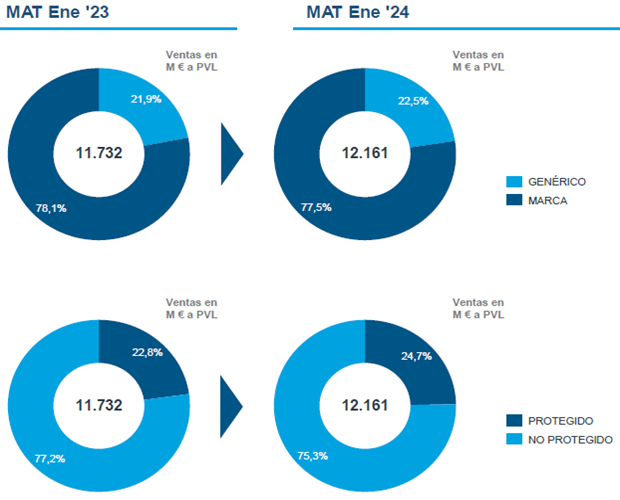 En el informe de ventas a almacenes y ventas directas que realiza la consultora IQVIA en el mes de enero de 2024, se ofrece el panorama de distribución del mercado de marcas y genéricos y del mercado de productos patentados (protegido) y no protegido (incluye marcas y genéricos).