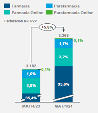 En el primer gráfico se puede observar un pequeño crecimiento de la Farmacia online y de la parafarmacia online que ya representan una cantidad próxima al 5%.