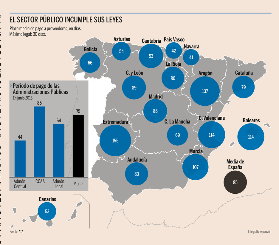 Las comunidades autónomas siguen siendo las peores pagadoras del sector público español, con un plazo medio de 85 días. Del descomunal incumplimiento que esto supone da buena cuenta la Ley de lucha contra la morosidad comercial, que establece una fecha tope de 30 días.Ninguno de los tres grandes niveles del sector público se ajusta a esa norma. Los entes locales se demoran 64 días, de media, en el abono de sus facturas a los autónomos, y la Administración central, 44. Esto deja el cómputo global de la morosidad pública en 75 días, según el último informe de la patronal ATA, con datos al cierre del primer semestre.